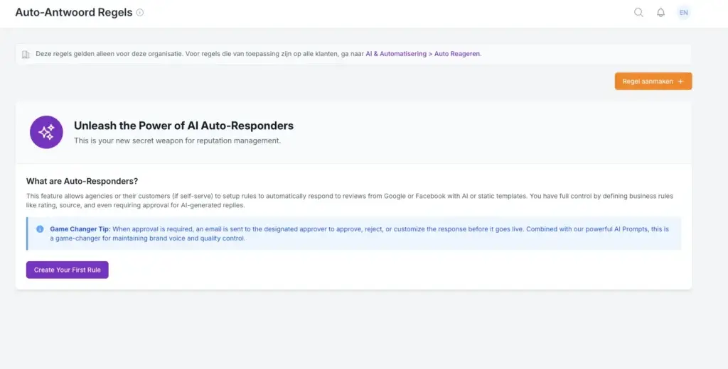 De AI Auto-Responder schrijft antwoorden die klinken alsof jij ze zelf hebt geschreven. Stel regels in per sterrenrating en platform, en bepaal of antwoorden direct geplaatst worden of eerst door jou goedgekeurd moeten worden.